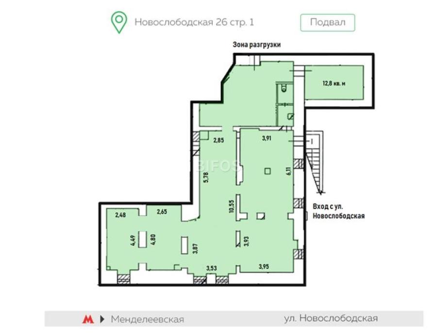 Цокольный этаж. Отдельный вход с улицы. Зона разгрузки во дворе, все инженерные коммуникации. Электрическая мощность 40 кВт. Приточно-вытяжная вентиляция. График работы 24/7. Место для вывески в прямой видимости с ул. Новослободская.