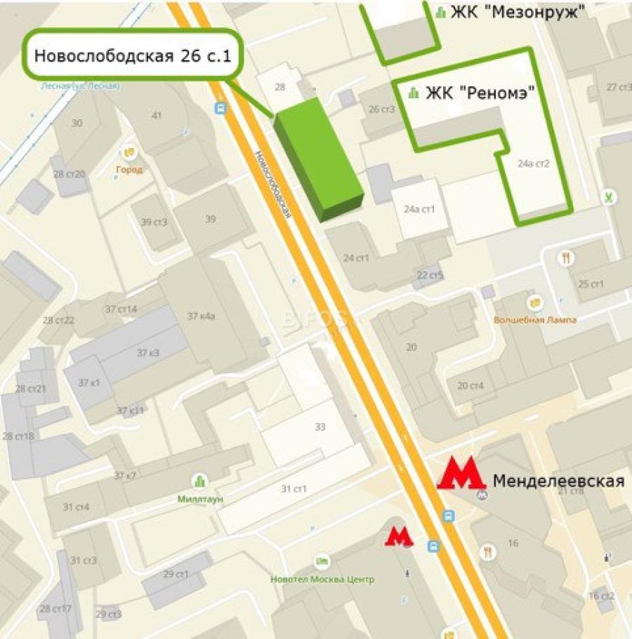 Торговое помещение на Новослободской 26, находится в непосредственной близости торговых и бизнес-центров с многочисленными посетителями потенциальными покупателями. Насыщенный пешеходный трафик, связанный с близким входом в метро Менделеевская, обеспечивает торговые предприятия постоянным притоком посетителей.