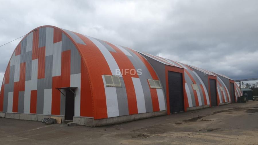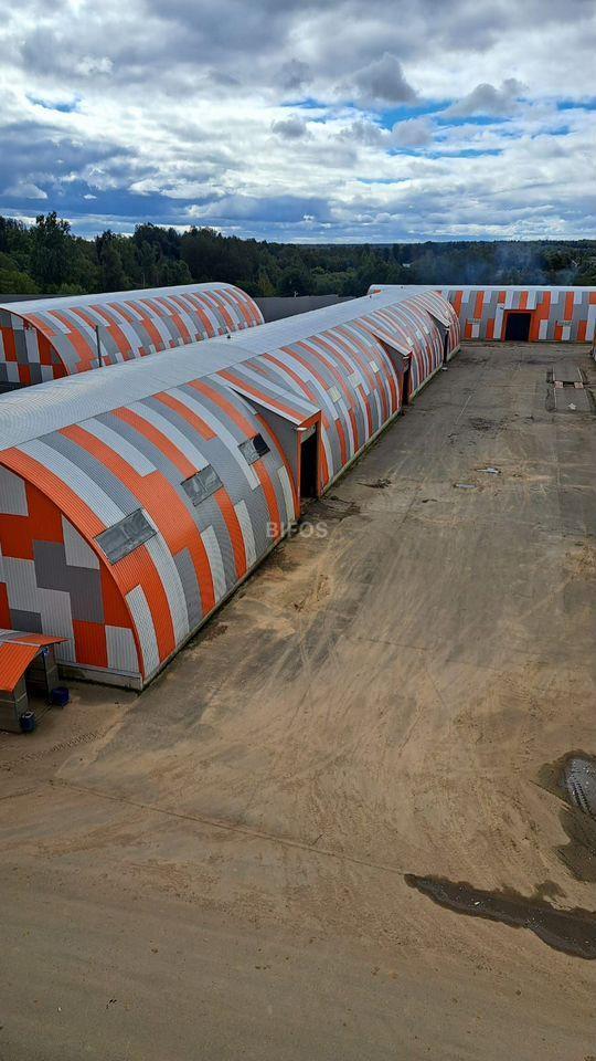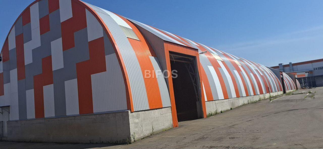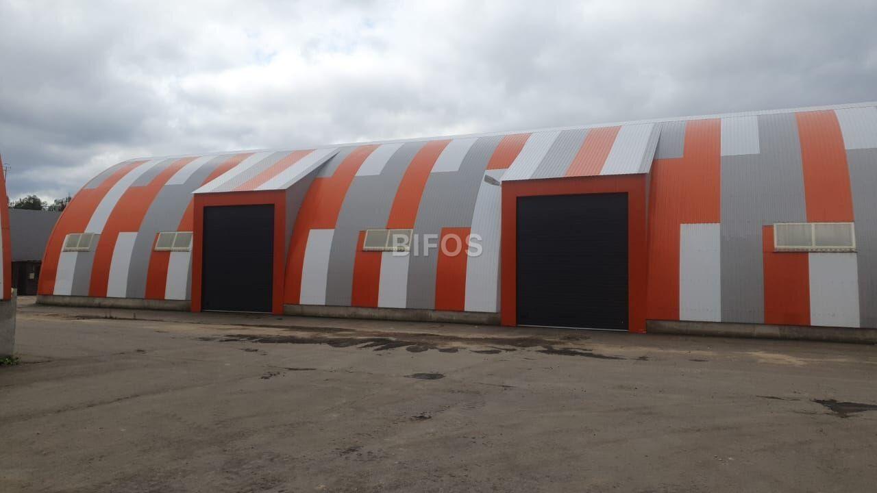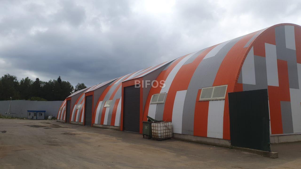 Склад арочного типа: высота потолка 8 метров. Шаг между фермами 6 метров.